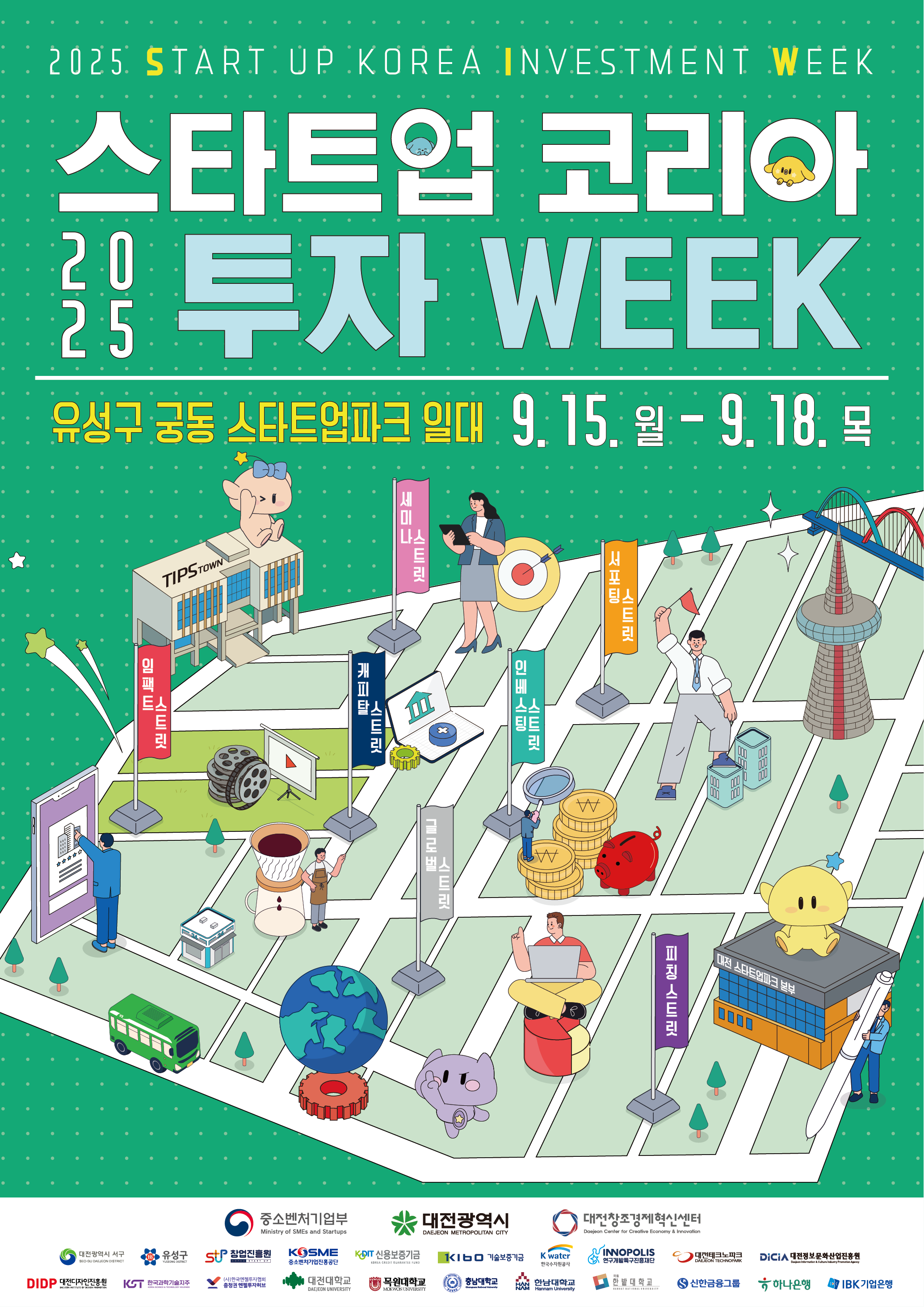스타트업 코리아 투자위크(Startup Korea Investment Week) 운영 사무국에서 국내 최대 규모의 골목형 스타트업 - 투자사 밋업 행사인 「2025 스타트업 코리아 투자위크(SIW)」가 9월 15일(월) ~ 9월 18일(목) 4일간 대전 유성구 궁동 스타트업 파크 일대에서 개최됩니다. 이에 1:1 밋업 프로그램에 참가할 유망 스타트업을 모집하오니, 많은 관심과 참여 바랍니다.